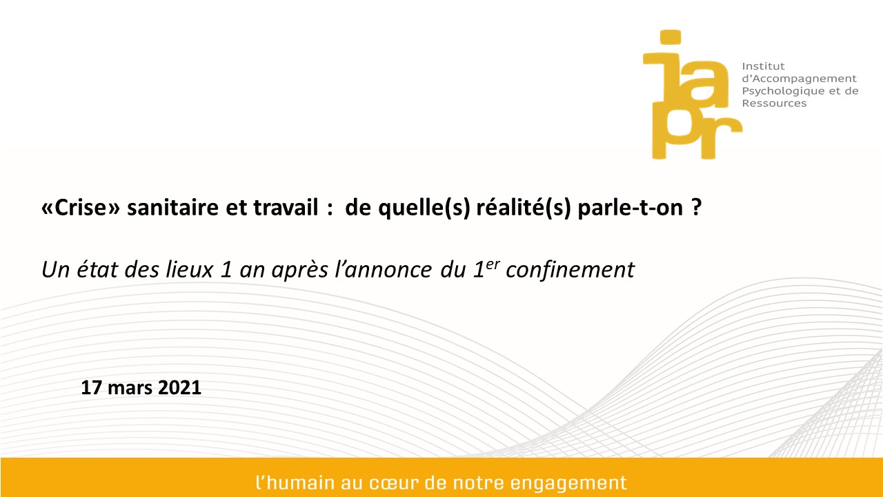 Un an après le début du premier confinement, l’IAPR vous propose une série de webinaires mensuels en lien avec la crise sanitaire. Le sujet sera abordé de manière participative, créative et innovante, notamment au regard des enjeux propres à chacune et chacun (RH, managers, médecins du travail).